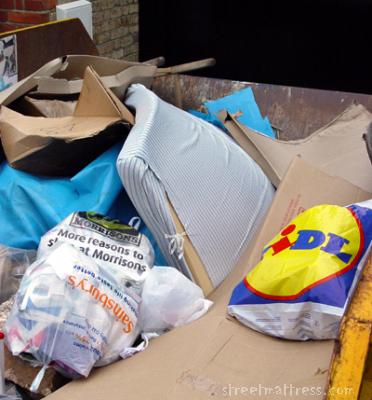 Sainsbury's, Morrison's and Lidl, three of the UK's leading supermarket chains, are represented here in this skip. |
