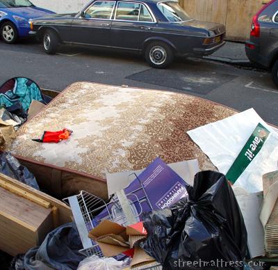 I had to wait until a man had finished poking around in the skip before I could take this mattress's picture. |