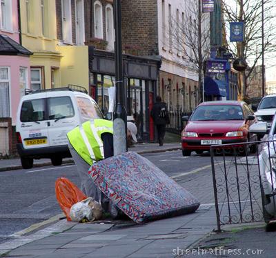 | This streetmattress is in the process of being apprehended by a faceless matcatcher from the DRIU. |