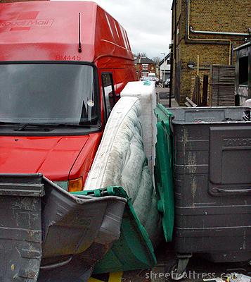 At first I wondered how the driver will get in his car when there's a mattress pushed up against his door. Then I remembered you're just a bunch of crazy Brits who didn't figure out where the driver should actually sit.