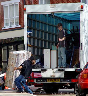 I was eagerly approaching this van, which was a "Mister Shifter" vehicle, from the front when I heard the rear shutter/door being closed. Darn, I thought. Then, as I drew level with the back I heard a voice say "Get the bed," and the door was raised. I saw the bed and continued to a polite distance to wait and take this covert shot of Mister Shifter and his helpful mate.