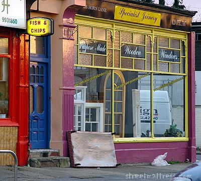 i like the postcard-worthy shop fronts, so attractively painted, and then the carcass against the window...
