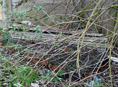 At the bottom of someone's back garden. Spied through a gap in the chipboard fencing, this very old mattress had lost most of its outer covering and was showing its horsehair(?) stuffing. Lahvly.