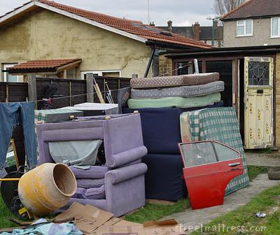 In a residential street I noticed a guy sitting in a derelict, wheel-less, red Mk I Ford Escort while his friend took photos. Other friends were bringing cushions out to put in the car. Then, as I looked up between the houses to the back garden whence they came, I saw what you now see in this photo. I asked if I could take a picture, and it turned out they were all Polish. There were about 10 friends all having a barbecue in the back garden next to all this stuff, but no one is pointing, because the owner only agreed to the photo on condition that I showed "no faces". They were all very friendly, though. Dziêkujê!