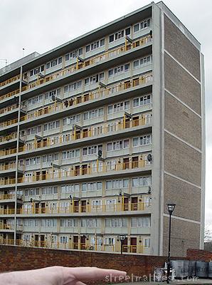 I'm pointing to a sofa-bed which is lying on its back. Its painfully thin mattress is poking out like a letter from a letterbox, behind the lamp post. High on a balcony, and maybe something else, a pair of figures who could be Vogon3 & psychobabble look on in horror.