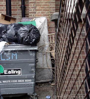 05 05 05. Even with a general election on, the hunt for streetmattresses continued. This one was in a yard behind shops off Ealing's Bond St. It looks rather long and thin, but it was definitely a mattress, as is further evidenced by the presence of the bed ends.