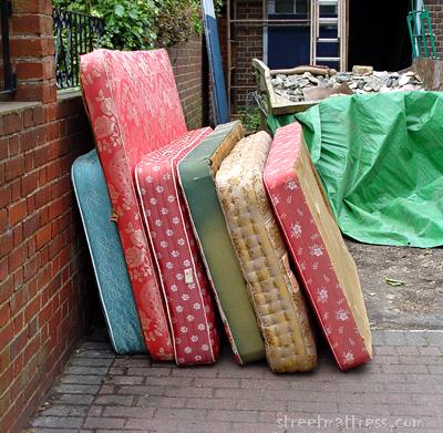 And here's the stack that netted me two bonus matts. It comprised three matts and three bases, all rather old-fashioned looking. To get this best-angle shot I decided to ask the two friendly-looking guys out front who were renovating the house if they minded. They didn't, smiling sympathetically as I prattled on about the website.