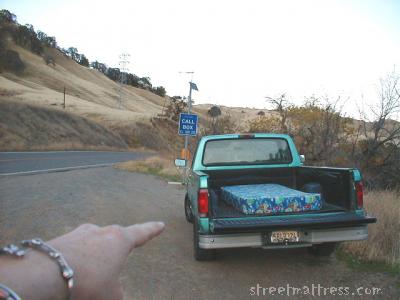 Looks like the driver got out to make an emergency call and was abducted...leaving behind his festive little mattress and truck. |