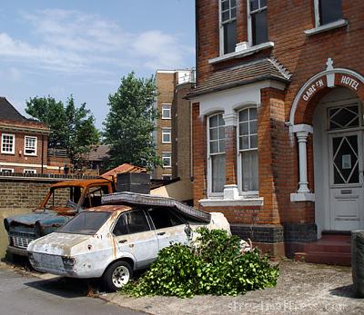 I think it's under new squatters. The chalked message on the wall reads: "Parking £5 per day or part thereof at car owner's risk". I'm reminded of what Axel Foley says in Beverly Hills Cop when he arrives at the posh Harrow Club in his old wreck of a car: "Can you put this in a good spot? 'Cause all of this shit happened the last time."
