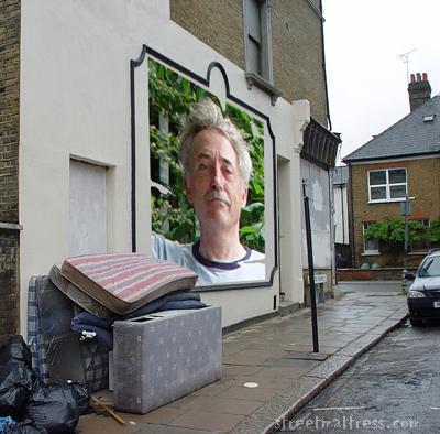 I originally photographed this location 5 days ago ("Wet Stuff"), then again less than 12 hours ago ("New Mattress on the Block"), and already the mattpile has changed again; the striped mattress is the latest arrival. The scaffolding has gone, too, and someone's put a poster up. Who is that guy? I reckon it's one of those teaser ad campaigns.