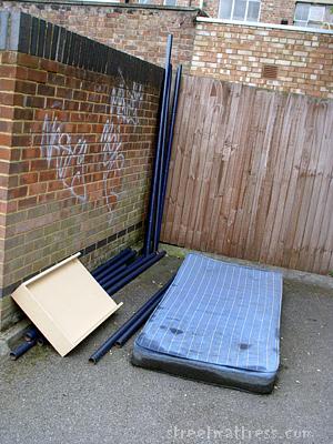 The mattress doesn't seem to mind being a bit damp as he waits beside the skipshack.