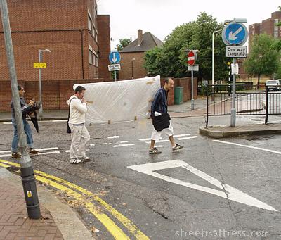 Sometimes matts come to you, rather than vice versa. I was walking to get a matt I'd seen 15 mins earlier (when I hadn't had my camera with me because it was recharging), and I'd switched the camera on in readiness, so when I spotted the Three Stooges here coming around the corner with their stained mattress, even though I had just two seconds to react, all I had to do was stand there and take the shot as they crossed in front of me. In the end, I didn't use the rainy shot I then took of the other matt, but went back and re-shot it later ("Bollardland").