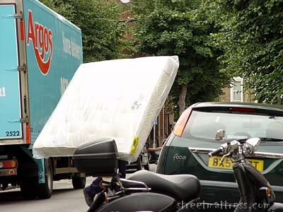 I saw the Argos truck go by my house as I sat in the car waiting for my daughter to join me, and wondered if there might be a mattress inside. I dropped her at a friend's, then quite by chance I saw the truck again, parked up. I stopped and waited, and soon some bits of wood were taken out - could be a loft bed - then this mattress. Result!