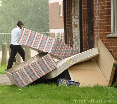 | People have such contrasting styles of mattress-dumping. No careful stacking in evidence here. (A Sleepmaker Mayfair, incidentally.) |
