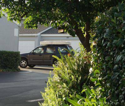 I was just walking over to our video rental store when I spotted this fellow driving in. I turn tailed and ran back to my truck to get my camera. They had turned the corner but I got there just in time. Note the scrunched matt in the back seat.