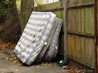 These mattresses are in the yard of the Mill Hill pub. See #9806 for a reverse-angle view. The grubbier mattresses here may have been in that shot too. The pub is very popular with the many Antipodeans who live in Acton, so, Dirty Steve, if you ever visit, this is the place to hang out.