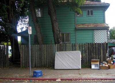 | nothing special just a big old mattress leaning against a big old fence in front of a big old green house |