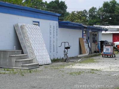 | A bicycle with no wheels, stairs with no door, a mattress outside...what kind of a place is this?!?! |