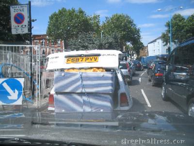 My first mattress on the move. Good thing there were roadworks, it slowed the traffic down enough to give me time to take a lot of pictures, and get the arrow in shot - even though it's not pointing the right way