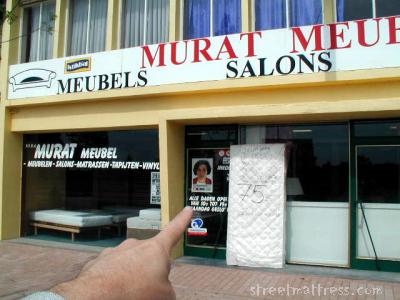 this is what internationalism is about, the name of the shop Murat, undicides if it is "meubel" or "meubels" (furniture), the correct word is "meubelen", on the door inkom and gümüssuyn" (probably turkish, an election poster for the senat the candidate is Fatma Phelivan, the list is Sp.a-Spirit (actually 2 parties, so I don't know if she is spa or spirit, and of course, a mattraas, with on the front of the shop "istikbal" (I don't know what language
