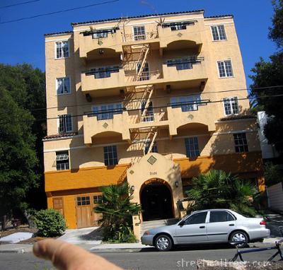 | classic oakland art deco-era apt bldg with a modern paint job |