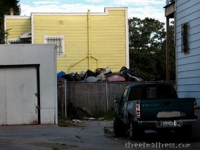 i probably average 6 matts on the mornings I go biking around Oakland. you have to remember West Oakland is not the most stable community lots of rentals and subsidized hostels, also it is a big garbage dump, expecially on the fringes. People get temporary, under the table, work cleaning out people's property but do not want to pay the garbage dump fees, so it goes out on the street.