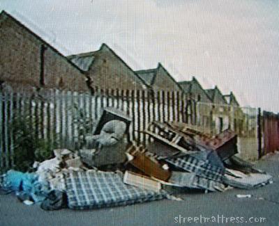 I taped a prank phone call show called "fonejacker" and was pleased to see this image flash up when the commentary mentioned "tasteful furniture": a classic streetmattress scene. I've a feeling it's one of Vogon3's photos.