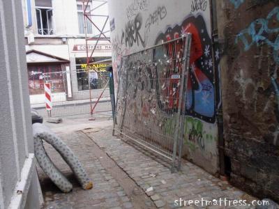 a very small street, vanderelst, entering rue de laeken, in the evening a corner for prostitution, in the afternoon a place for graffity, in the morning hours a place to rest for a small mattress with blooming blue fowers all over, affaire à suivre