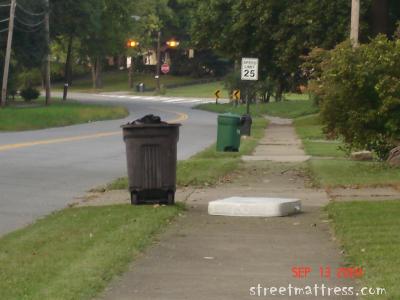 We pulled up to an intersection and saw this mattress blocking the sidewalk. Alice zoomed in on it and got a great picture. |