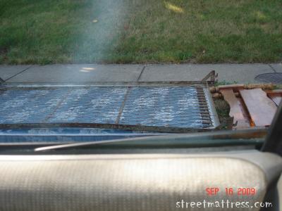 | Looking out my car window, a blue mattress with a bed frame on top of it. The beam of light is from the Starship Enterprise. |