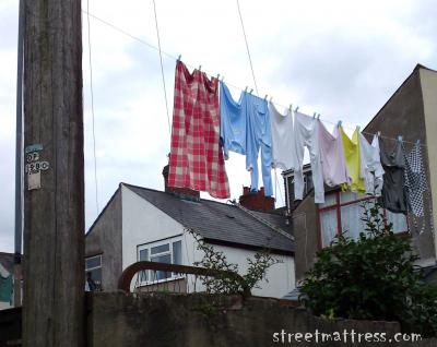 | Underneath the washing an old bed frame looks over the wall |
