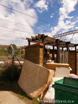| A train from Willesden Junction en route to Kensal Rise passes this lovely mattress. We were blessed with gorgeous weather on our matt hunt. |