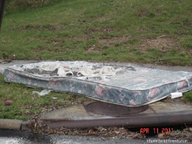 | This mattress was on a tree lawn of a very nice house. I can't believe that someone was actually sleeping on this. |