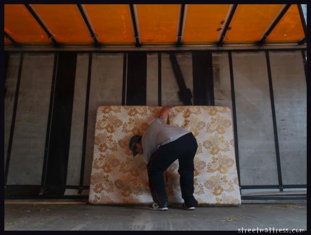 | it's in a big truck, and not the best way of carrying a mattress, if he gets old enough, his back will hurt sooner or later |